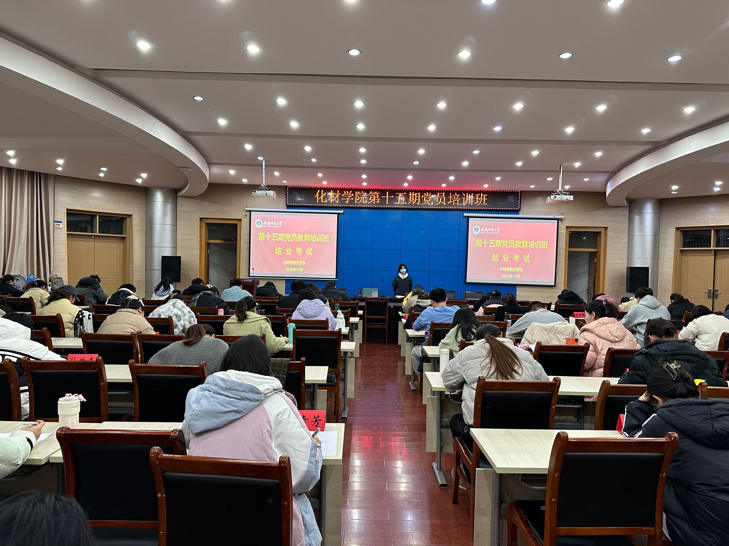 结业考试,检验学习成果。为检验本期党员培训班学员理论知识掌握程度和培训学习成果。12月2日晚,培训班87位预备党员在会议中心第三报告厅进行了结业考试。考试过程中,全体预备党员同学考风端正,纪律严明,认真作答。