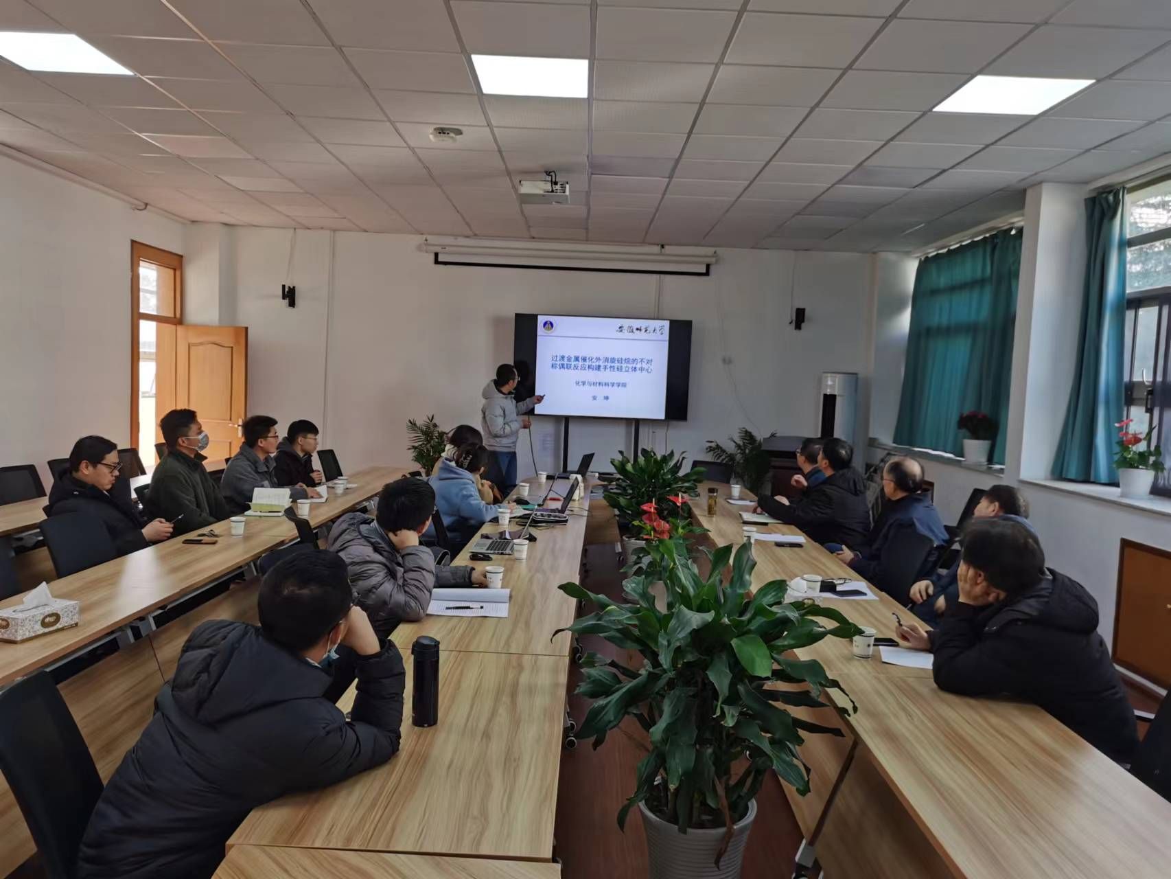 安坤、陈硕、史高鹏、司家奇、王新、魏南、张文卿、郭幸等八位教师分别作了题为“过渡金属催化外消旋硅烷的动态动力学不对称偶联反应构建硅手性中心”、“钼基单原子-亚纳米团簇双位点催化剂催化甲苯选择氧化合成苯甲醛的研究”、“非晶聚合物的气体阻隔性能与玻璃化协同转变关联研究”、“表面氧物种可控调变及其在甲烷氧化偶联反应中的机理研究”、“基于热渗透原理的光驱动微混合器的设计及研究”、“液态金属基底上二维镓基合金单晶的可控生长及性质研究”、“氧化物负载钯基合金纳米颗粒用于光催化甲烷官能化调控研究”、“基于光治疗ROS响应型近红外染料的合成及靶向动脉粥样硬化斑块诊疗研究”的基金选题汇报。分别从选题背景、国内外研究现状、个人科研背景和拟申报项目主要研究内容等方面介绍了将要申请项目的情况。
