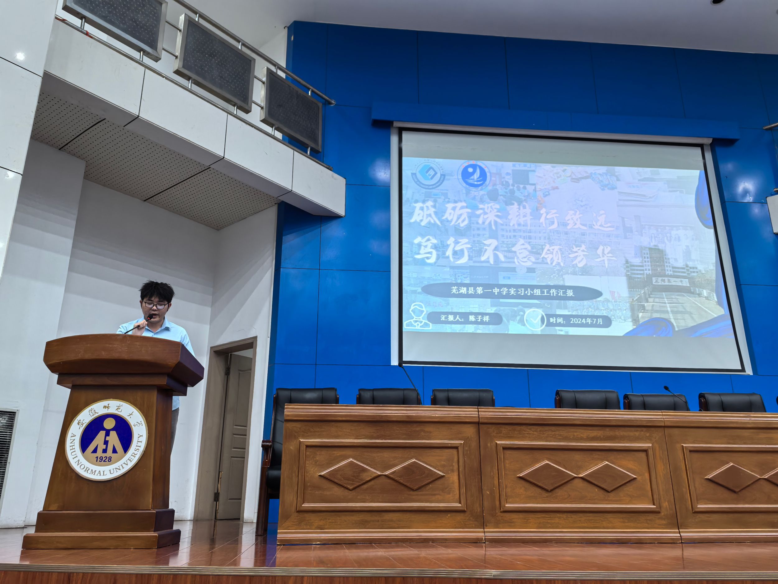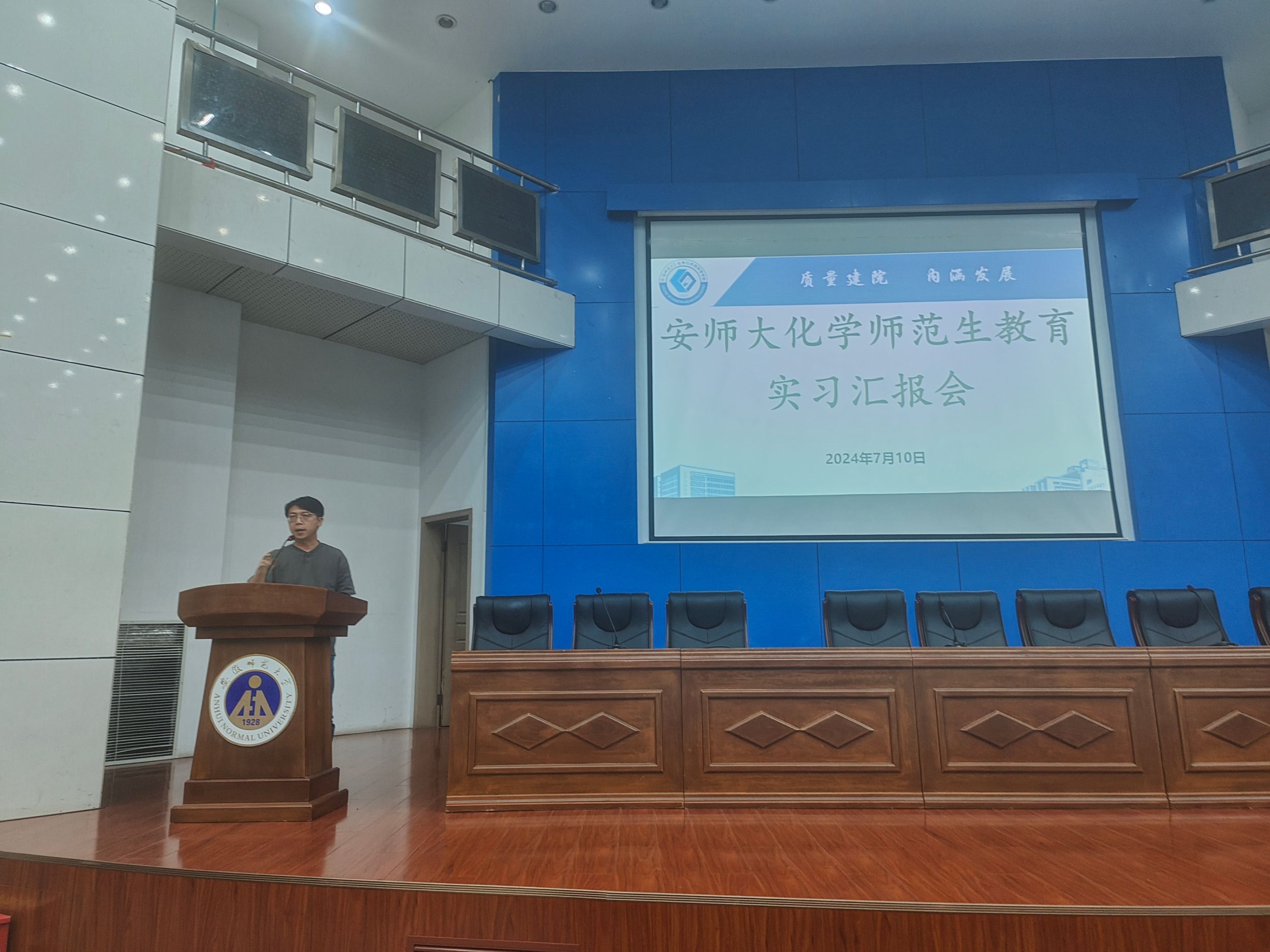 程瑶琴简述了本次教育实习的基本情况,随后,来自歙县中学、屯溪一中、当涂一中、安师大附中、芜湖县一中等16所实习单位的实习生代表分别对各自实习小组的实习成果进行依次汇报。他们结合着各自两个多月以来的实习经历,围绕着“教研观摩”、“教学开展”、“班主任工作”、“特色活动”等方面展开汇报,分享了实习期间的感受与收获,并深刻反思了实习过程中遇到的挑战和问题。