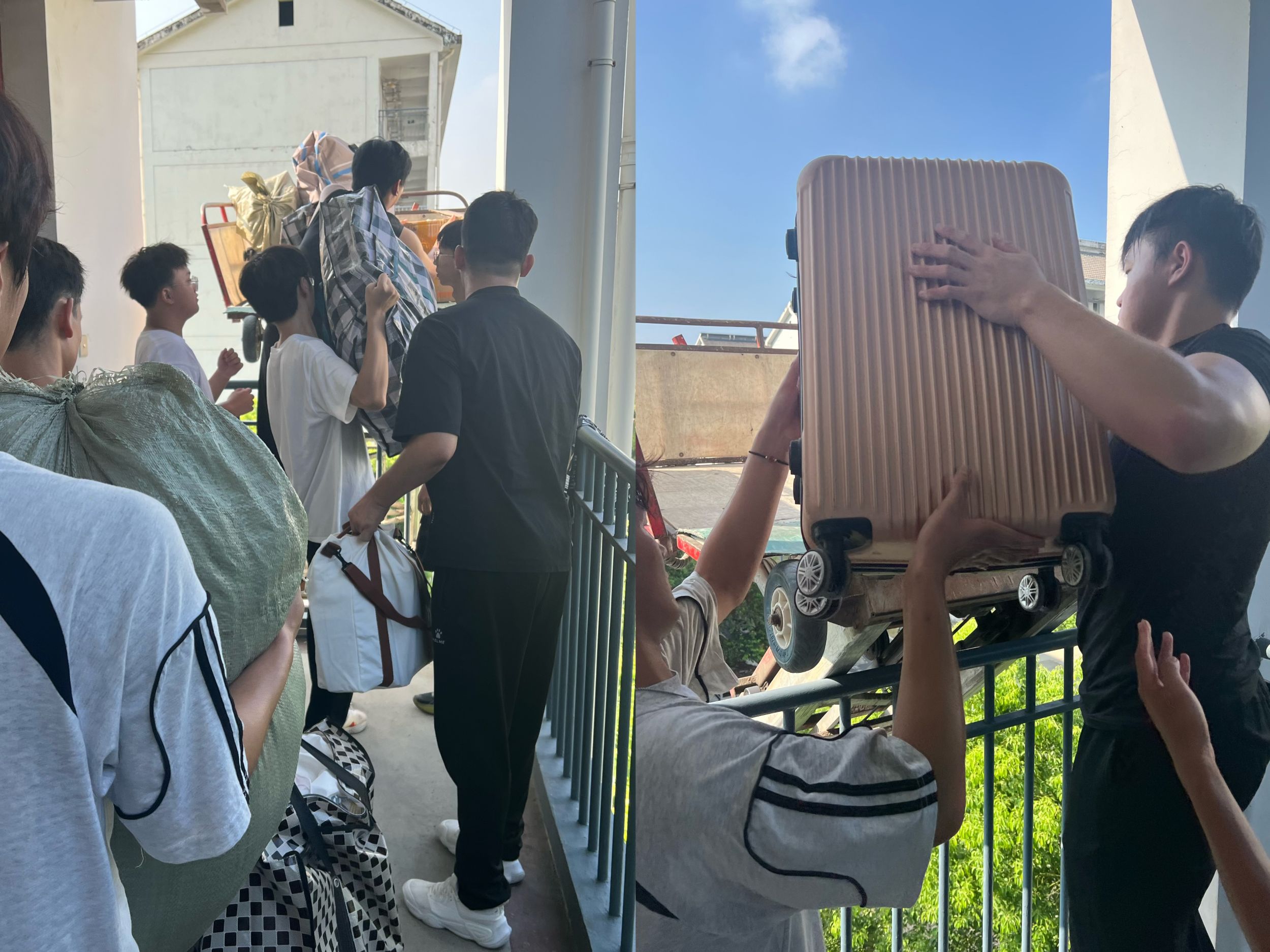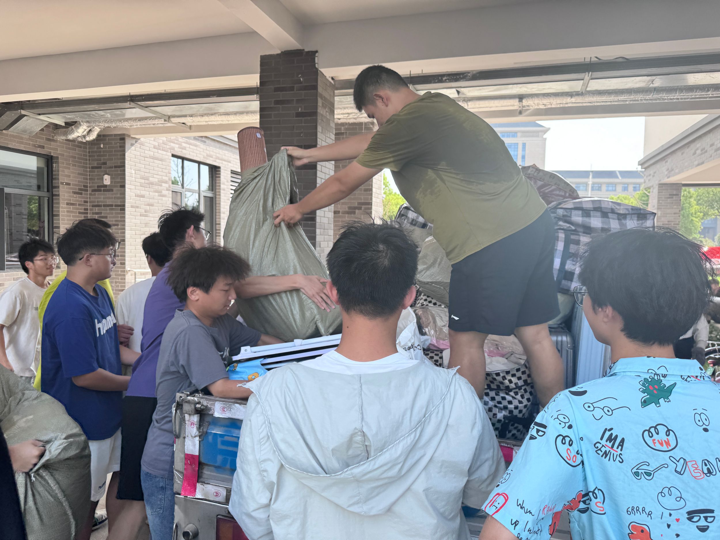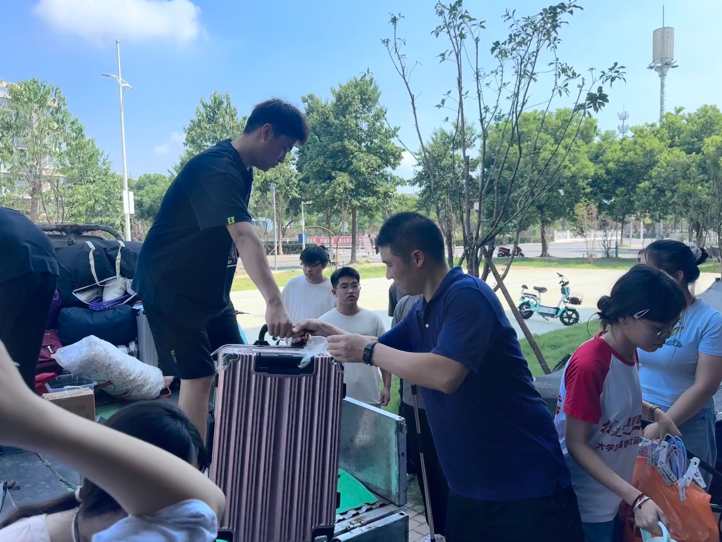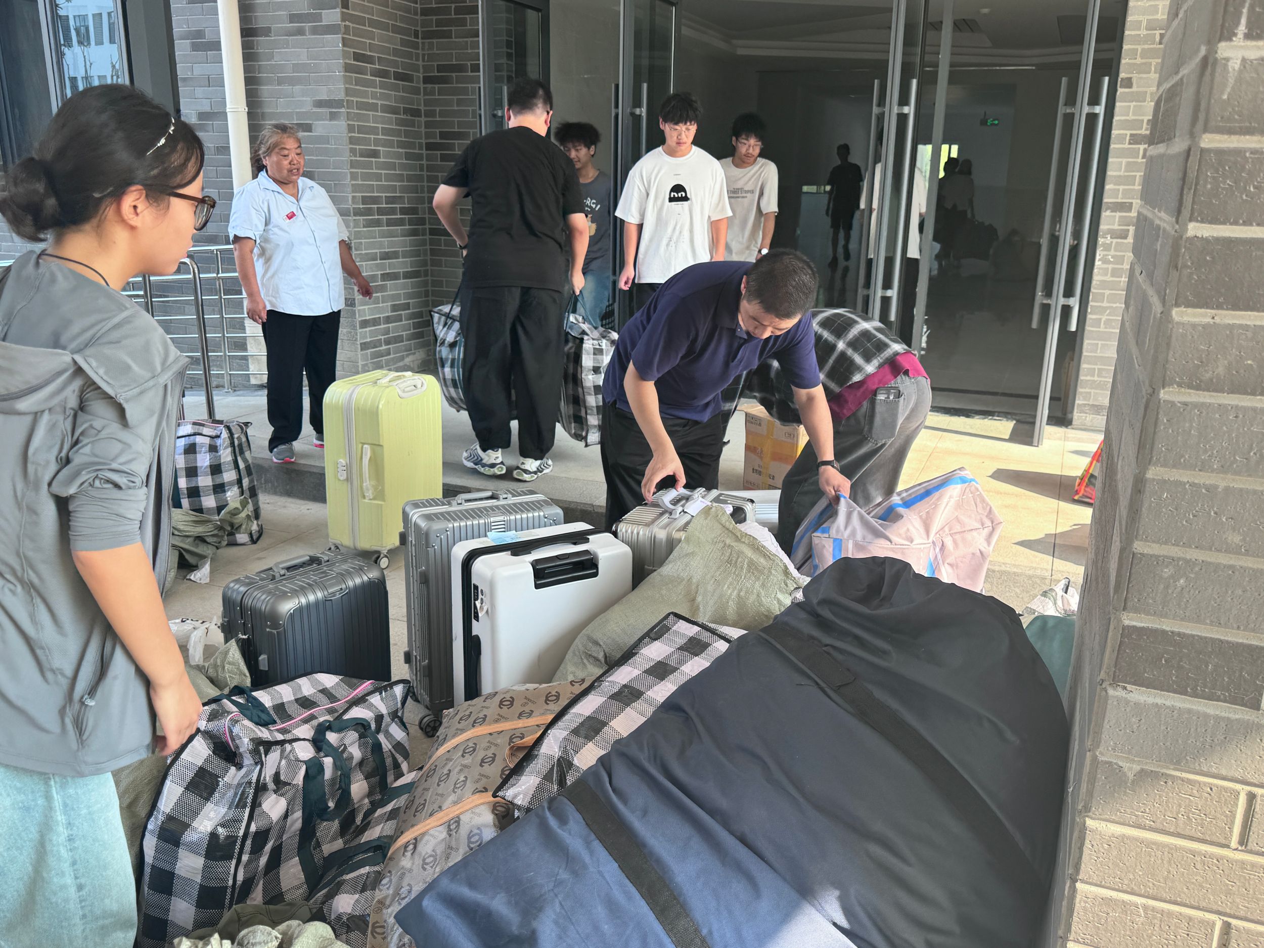 不惧酷暑,同心协力。宿舍搬迁现场,公司党委副书记李古州、团委书记梅冠东与全体专兼职辅导员一道,参与进搬迁工作中,协调现场物品运送秩序,帮助同学们托举重物行李。一包包贴着标签的行李整齐的排列在货车上,员工志愿者在行李运送的每个环节都紧密协作,做到行李物品“零遗失”。
