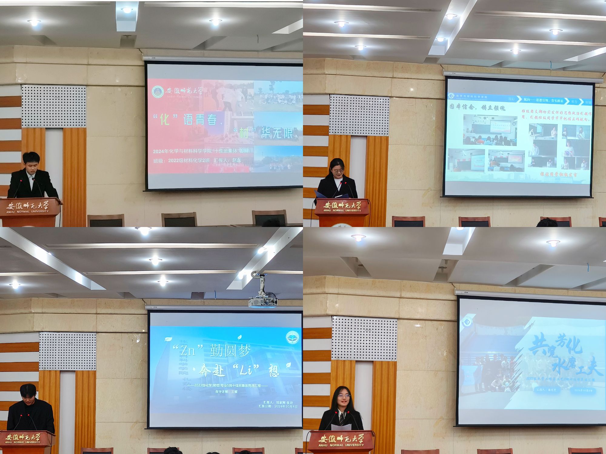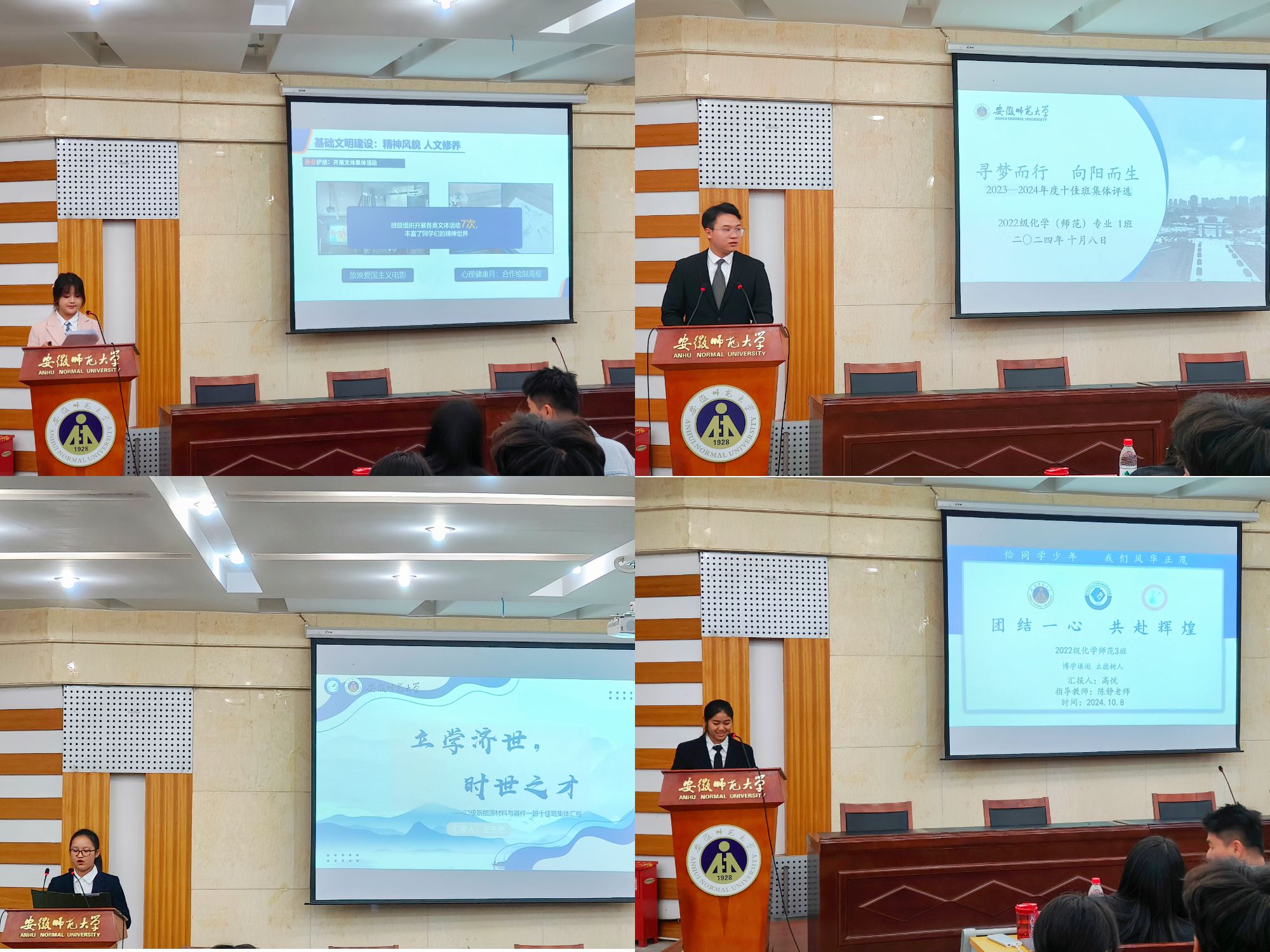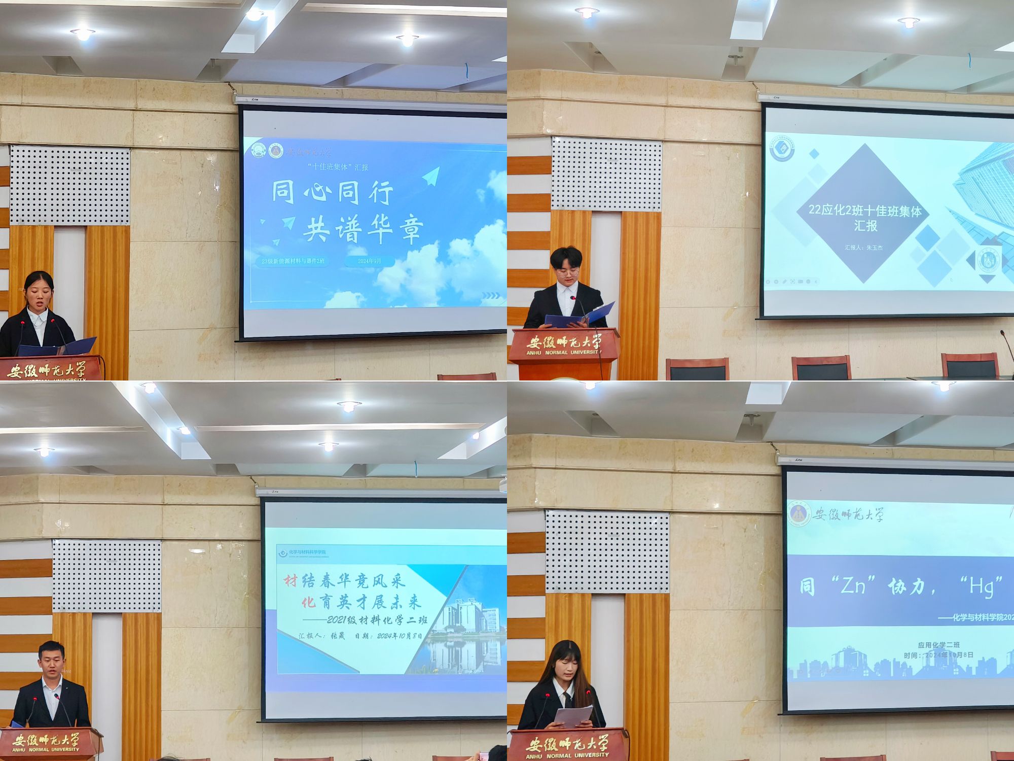 本次公司“十佳班集体”评选共有19个班集体参加现场汇报。各班代表依次上台汇报,他们生动地向评委老师及同学们展现班级的卓越风采。“材结春华竞风采,化育英才展未来”21级材料化学2班的同学们在学科竞赛方面全面开花、在志愿服务方面躬身奉献,努力为社会贡献一份力量;“化风为师韵,Cu Zn共筑梦”22级化师2班的班级代表用具体的数字展示了班级独特的风采,高课程通过率、高竞赛获奖率是班级优良学风的展现,更是同学们对自我要求的完美诠释;“Zn勤圆梦,奔赴Li想”23级化师5班的汇报人表达班级成员团结拼搏,勇敢逐梦,昂扬向上的学习态度和人生姿态。各班级的演讲十分精彩,每一段文字、每一张图片,都是化材人良好班风建设的体现。
