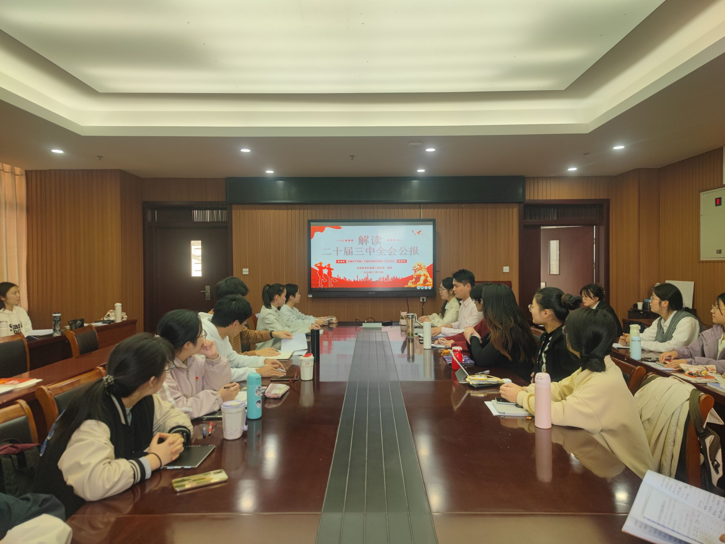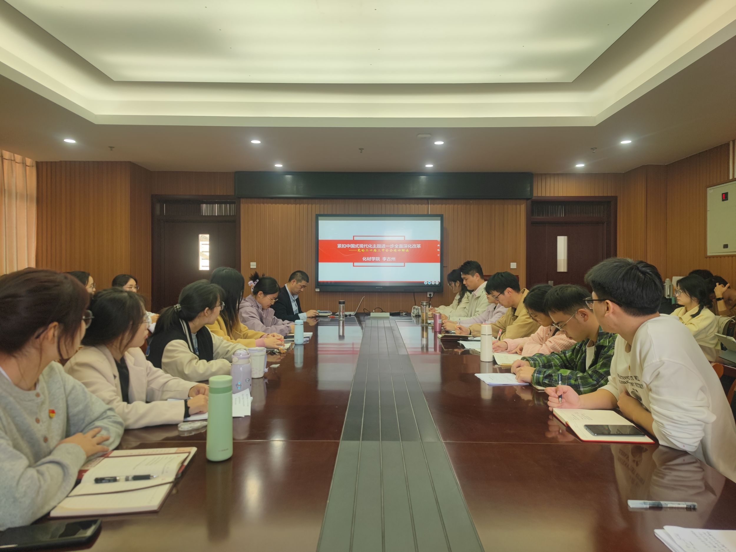 会议第一项议程,开展理论学习。李古州围绕党的二十届三中全会精神解读,为化学系本科生第二党支部及应化系本科生党支部全体党员讲授专题党课。李古州以“紧扣中国式现代化主题进一步全面深化改革”为题,指出这次会议是在新时代新征程上,中国共产党坚定不移高举改革开放旗帜,紧紧围绕推进中国式现代化进一步全面深化改革而召开的一次重要会议。它不仅是党的十八届三中全会以来全面深化改革的实践续篇,也是新征程推进中国式现代化的时代新篇,被视为党历史上又一重要纲领性文献。李古州在党课中指出,学习好贯彻好党的二十届三中全会精神,被视为当前和今后一个时期全党全国的一项重大政治任务。希望支部全体党员全面贯彻落实自我革命的重要思想,尊重和维护党章,聚焦实干导向,用青春推动党的事业高质量发展。