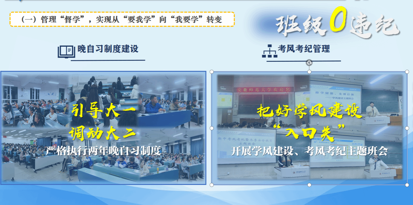 管理“督学”,实现从“要我学”向“我要学”转变。班级认真落实《英国正版365官方网站学风建设工作方案》,严格执行手机入袋、考勤制度;辅导员定期听课,通过学风建设、考风考纪主题班会,把好学风建设的“入口关”,班级“督学”效果显著。