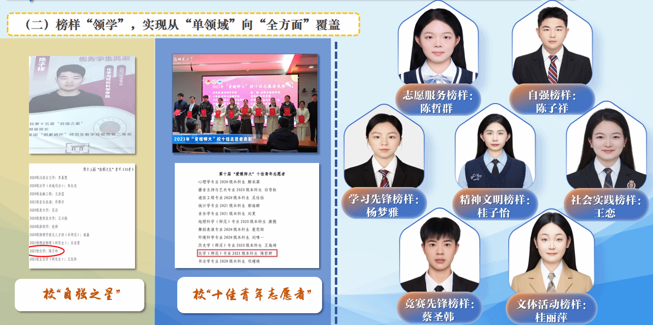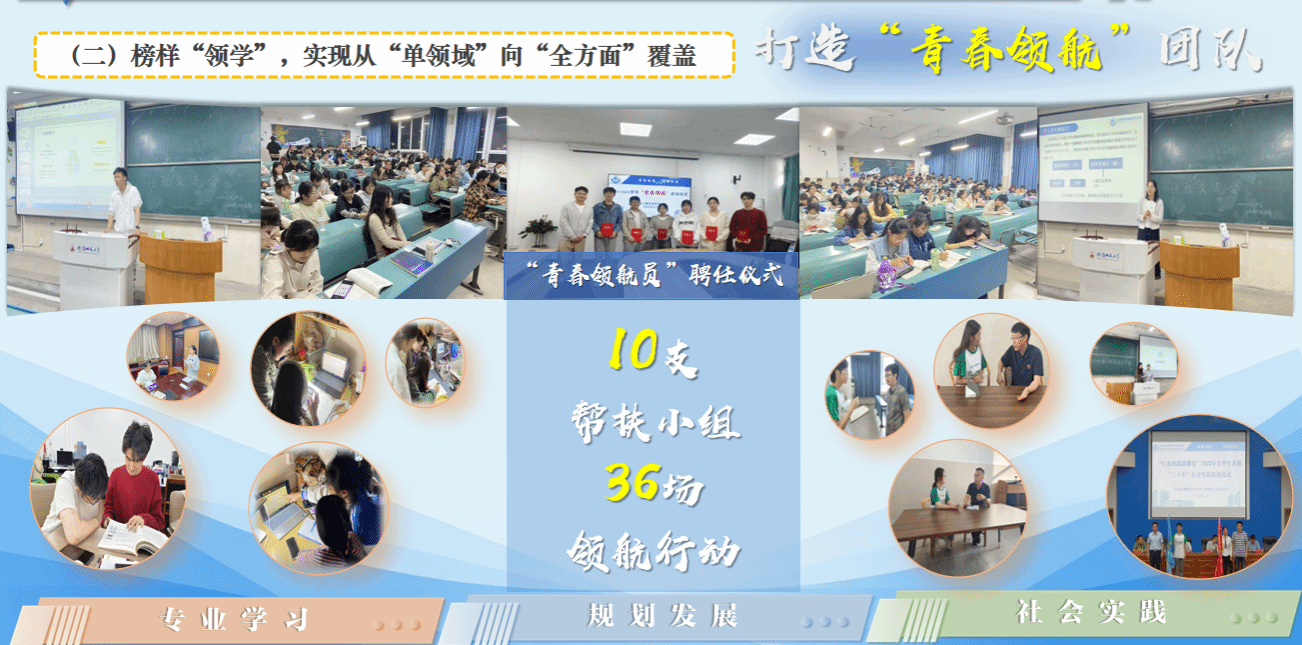 榜样“领学”,实现从“单领域”向“全方面”覆盖。班级涌现出多名院“优秀老员工”、校“自强之星”、校“十佳青年志愿者”等多名“榜样领航员”,组建“青春领航”团队,自活动开展以来,累计组建10支帮扶小组,开展“领航行动”36场次。
