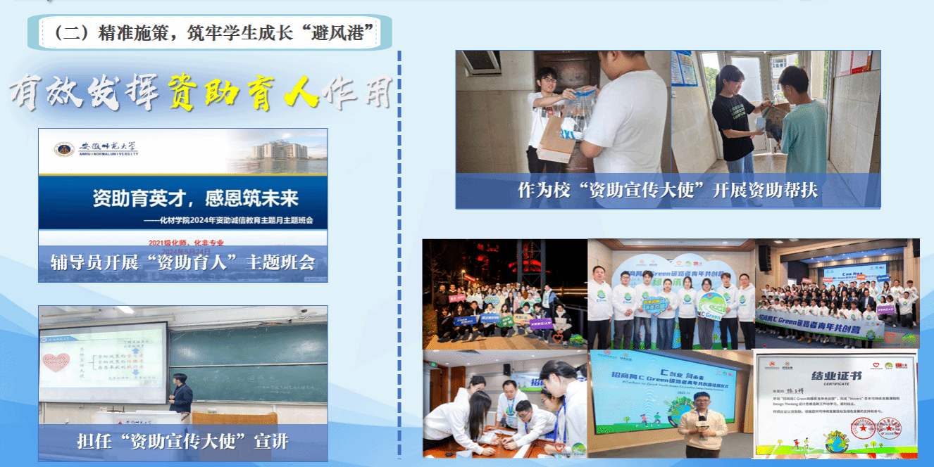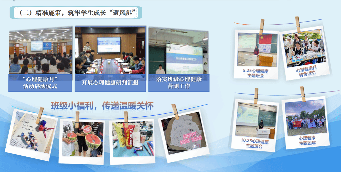 精准施策,筑牢员工成长“避风港”。班级实施特殊群体关爱项目,持续推进员工帮学志愿服务岗、教师帮学导师团,定期召开学业预警员工座谈会、家长会,切实做好对学业困难员工的帮扶、教育工作。班级有效发挥资助育人作用,做好典型选树和感恩教育,同时落实闭环工作机制,定期做好心理健康普测,做好不同阶段心理疏导工作。
