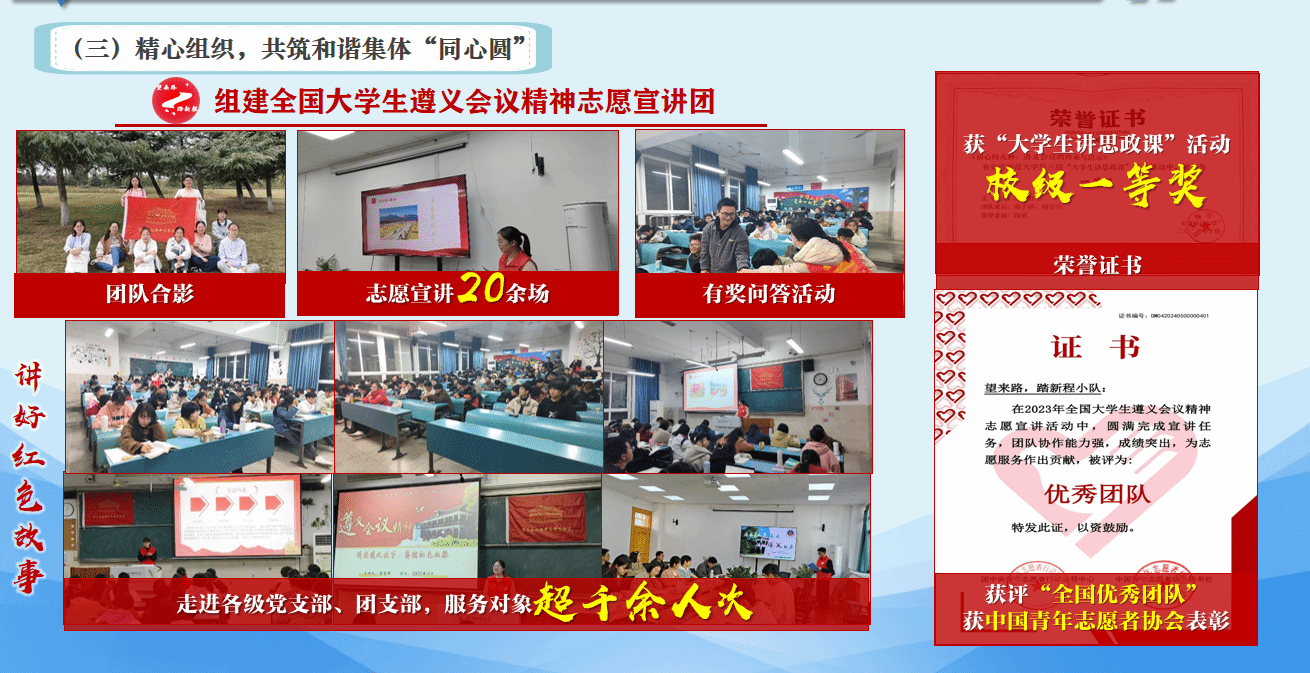 精心组织,共筑和谐集体“同心圆”。班级社会实践和志愿服务参与率100%,志愿服务总时长近10000小时,班级同学组建全国老员工遵义会议精神志愿宣讲团,获中国青年志愿者协会表彰,获评“全国优秀团队”。三年以来,班级多次开展特色文体活动,种种福利,张张合影,洋溢着真挚的情感。