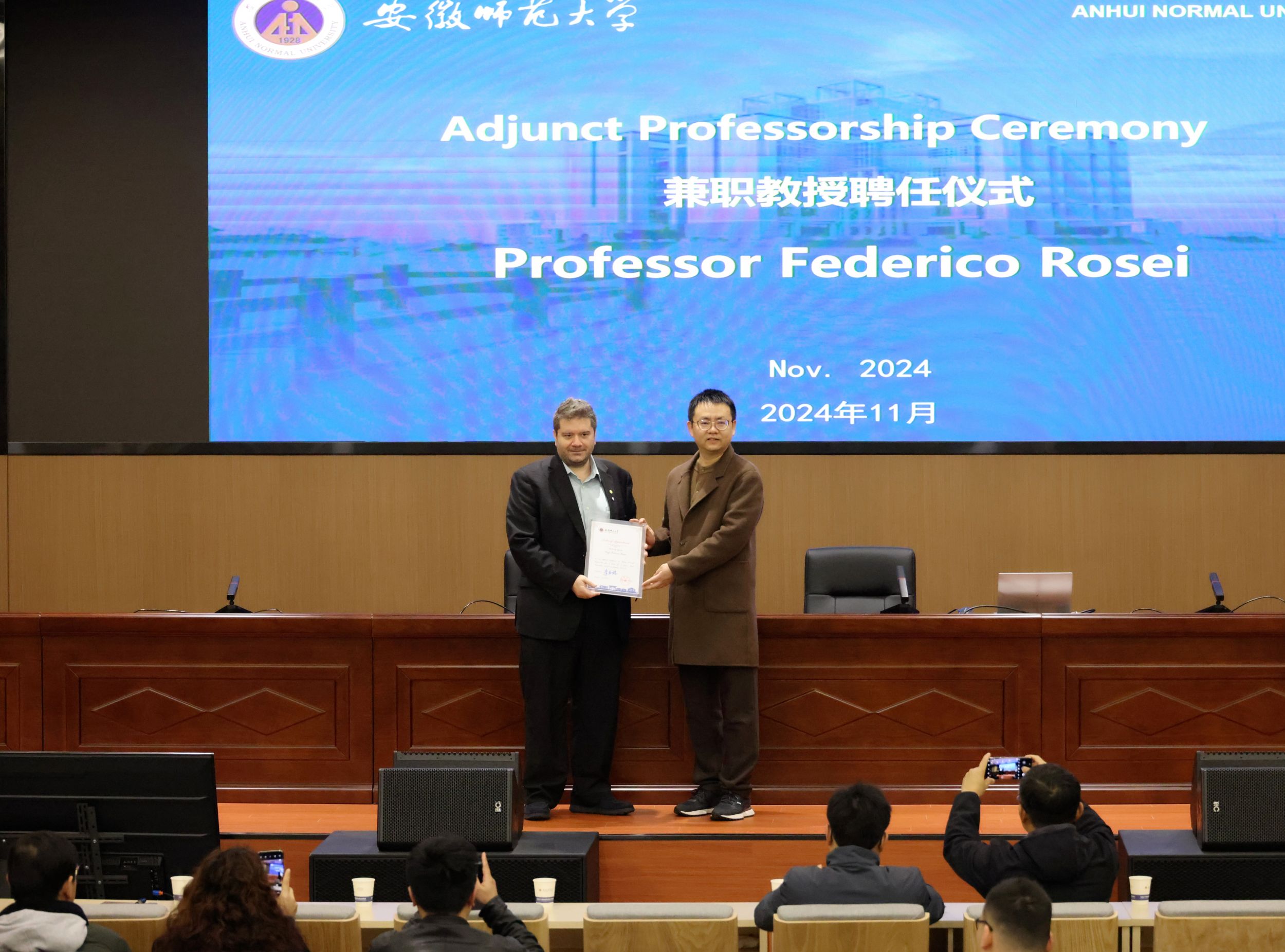 2024年11月20-22日,意大利的里雅斯特大学Federico Rosei院士访问公司,并举行系列学术活动。11月21日,Federico Rosei院士受聘公司兼职教授仪式暨学术报告会在文典楼西侧裙楼三楼视频会议室举行。公司党委副书记、常务副董事长熊宇杰教授主持学术报告会,并向Federico Rosei院士颁发兼职教授证书。校人事处、国际交流合作处、英国正版365官方网站部分师生参加了此次报告会。