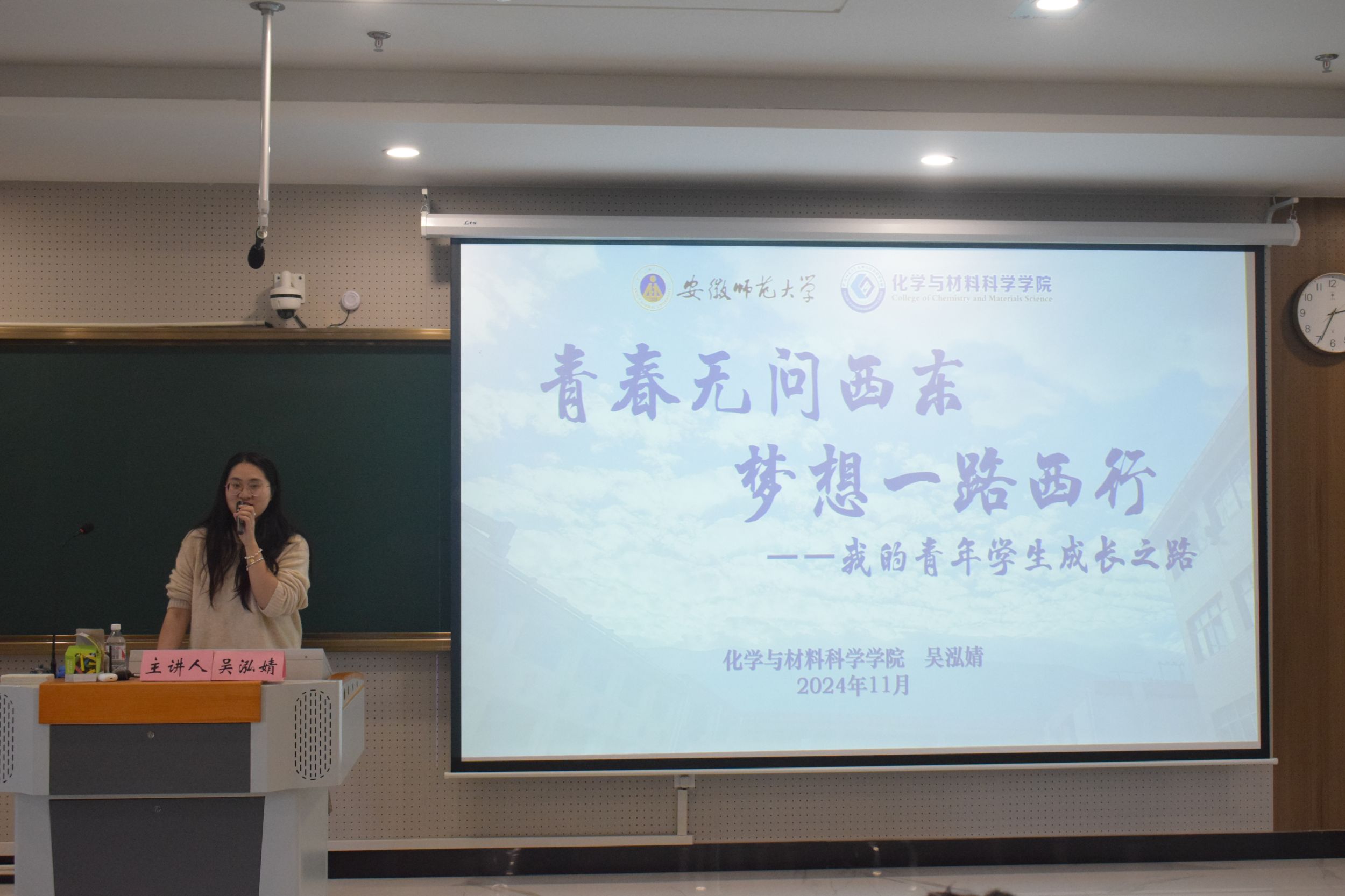 校第25届研支团志愿者、化学专业2024级研究生吴泓婧以“青春无问西东,梦想一路西行”为主题,介绍了自己作为学团骨干和研究生支教团成员期间的经验与感悟,分享了个人成长事迹。在员工干部方面,她结合自身多员工干部的经验,建议学弟学妹们沉下心、弯下腰,积极主动地为同学们服务,在实践中提升个人能力。在支教团经历分享中,她深情讲述了自己在四川省普格县支教过程中的所见所闻、所思所感,以及这段经历给自己带来的成长与收获,让同学们深刻感受到了奉献的力量和责任的重大。在讲座的最后,她送给同学们一段话:“在三尺讲台上助力员工成长,用主题团课讲好新时代故事,用热情和耐心温暖少数民族学子心灵,用实际行动诠释当代青年的责任与担当!”