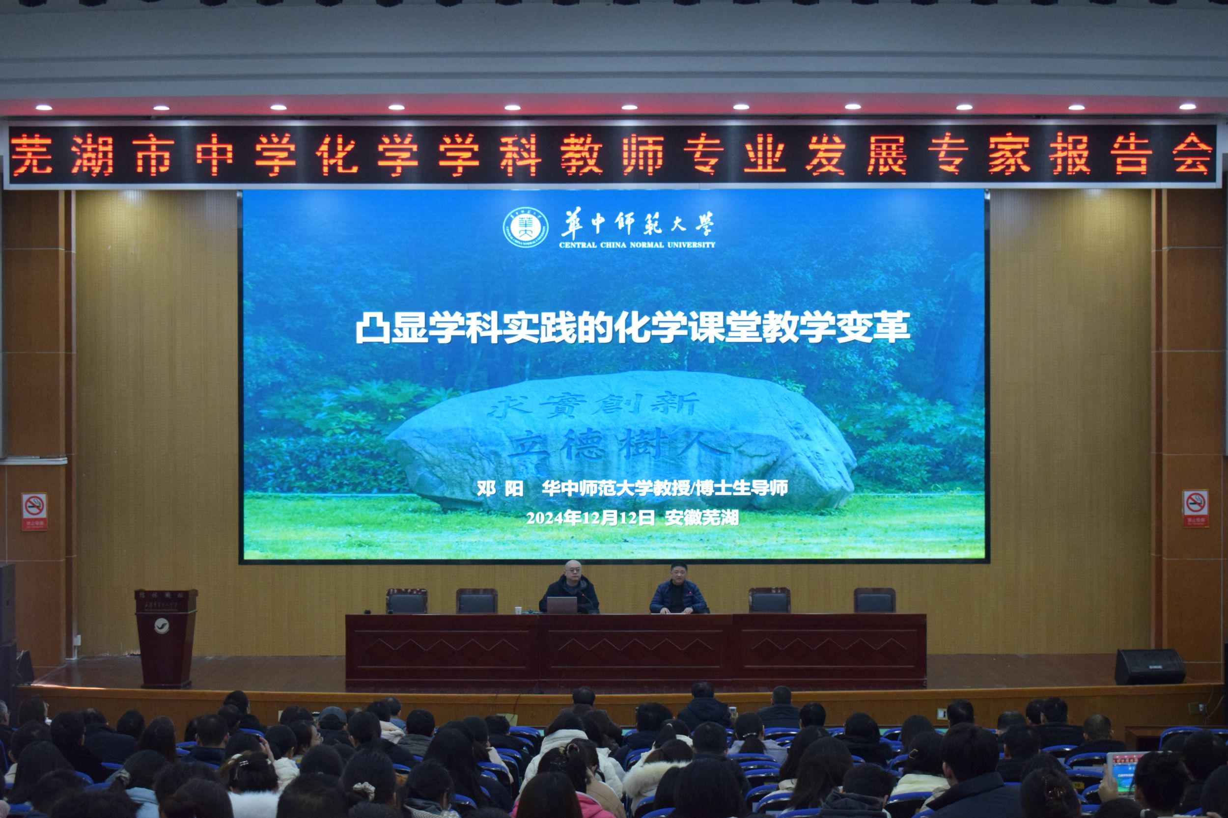 (英国正版365官方网站 王玮健)12月12日,由芜湖市教育局教研室、芜湖市第十二中学共同举办的中学化学教师专业发展专家报告会如期举行,来自华中师范大学的邓阳教授为在场的师生带来了一场精彩的报告。在公司孙影、程瑶琴、周冬冬三位老师组织安排了英国正版365官方网站2022级化学师范生的教育见习活动,员工沉浸式参与了本次教研活动。本次报告的主题为“凸现学科实践的化学课堂教学变革”,旨在通过具体案例分析和前沿教育理论,推动化学教学方式的创新与提升。