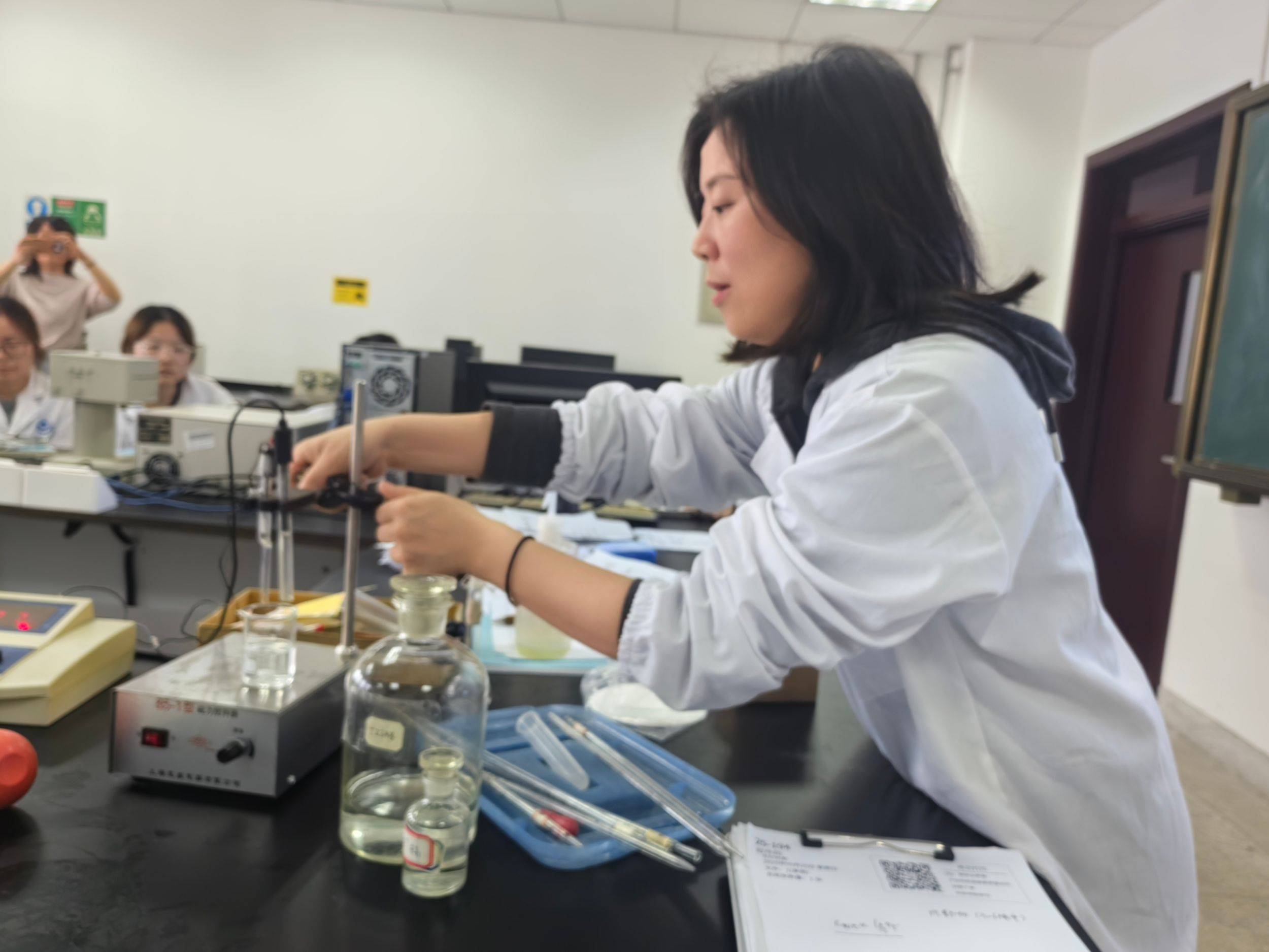 接下来,王广凤老师为我们介绍了本次实验所要用的各种实验仪器及使用方法,并亲自为我们演示了pH酸度计的使用方法及注意事项,同时,围绕着“标准曲线法”这一重要的实验方法,为我们详细介绍了本次实验数据的处理方法与结果展示。之后,各组员工亲身投入实验,王广凤老师也时刻在一旁指导,密切关注着大家的操作,适时对大家的错误操作予以纠正,也鼓励大家尝试一些创新性的操作,时常结合着实验的原理知识,将知识搬下课本,实体化为实验中的点滴细节,为我们展示了一位合格的、优秀的化材人的科学风采。
