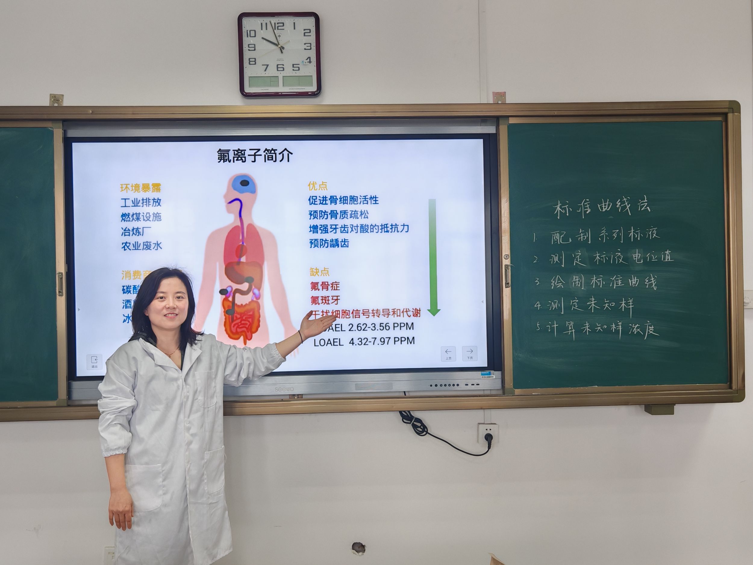 此外,在授课过程中,王广凤老师还强调了在日常生活中氟离子检测的重要意义,指出人体接触的氟离子浓度应严格控制在一定范围,氟离子浓度过高容易引发氟斑牙、氟骨症等病症,过低则会导致骨质疏松、龋齿等。王广凤老师也由此引出了本次实验中对于牙膏样品中氟离子含量测定的重要意义,由科学知识过渡到生活实际,让这堂公开课成为了大家感受化学魅力的平台,也为员工们今后的学习与成长描绘了新的蓝图。