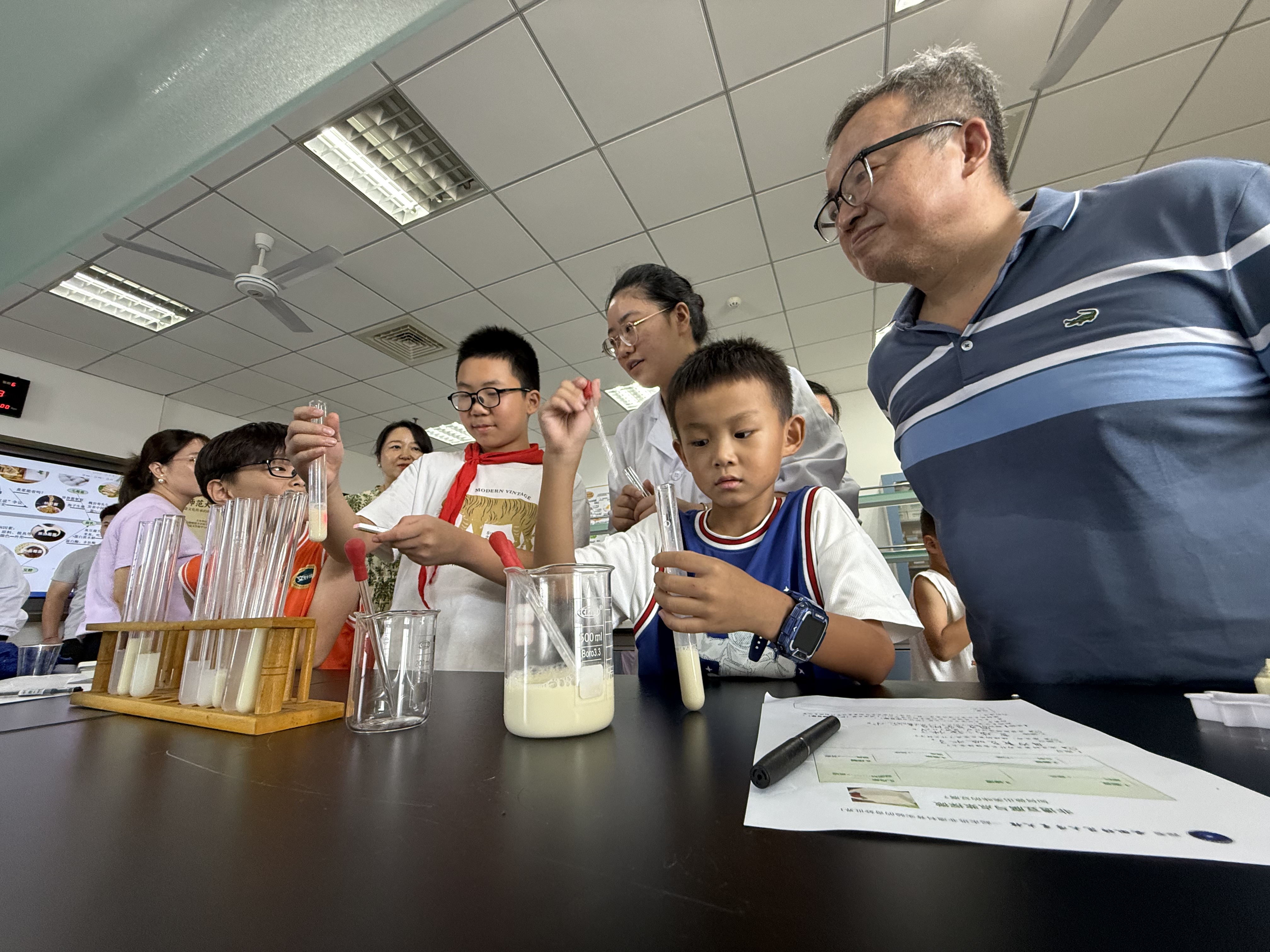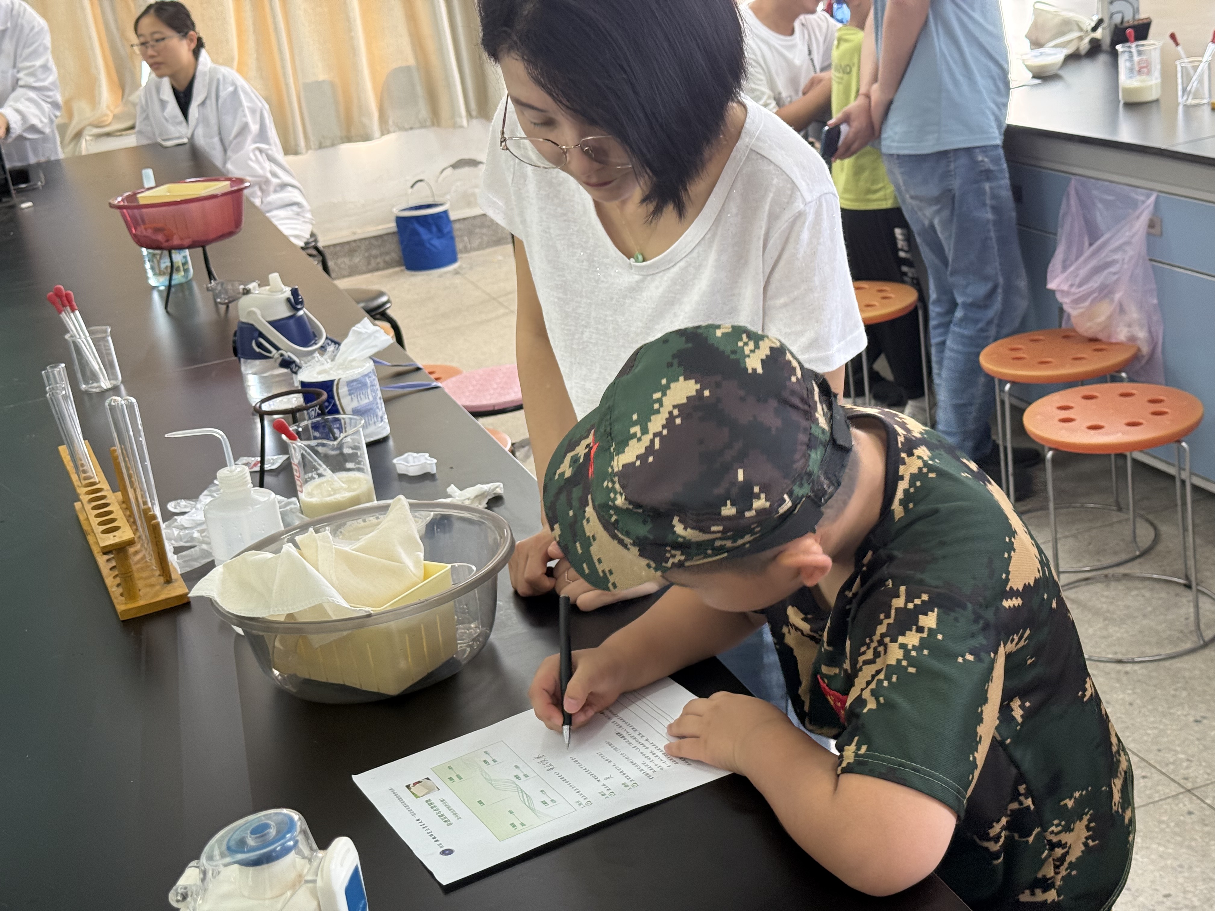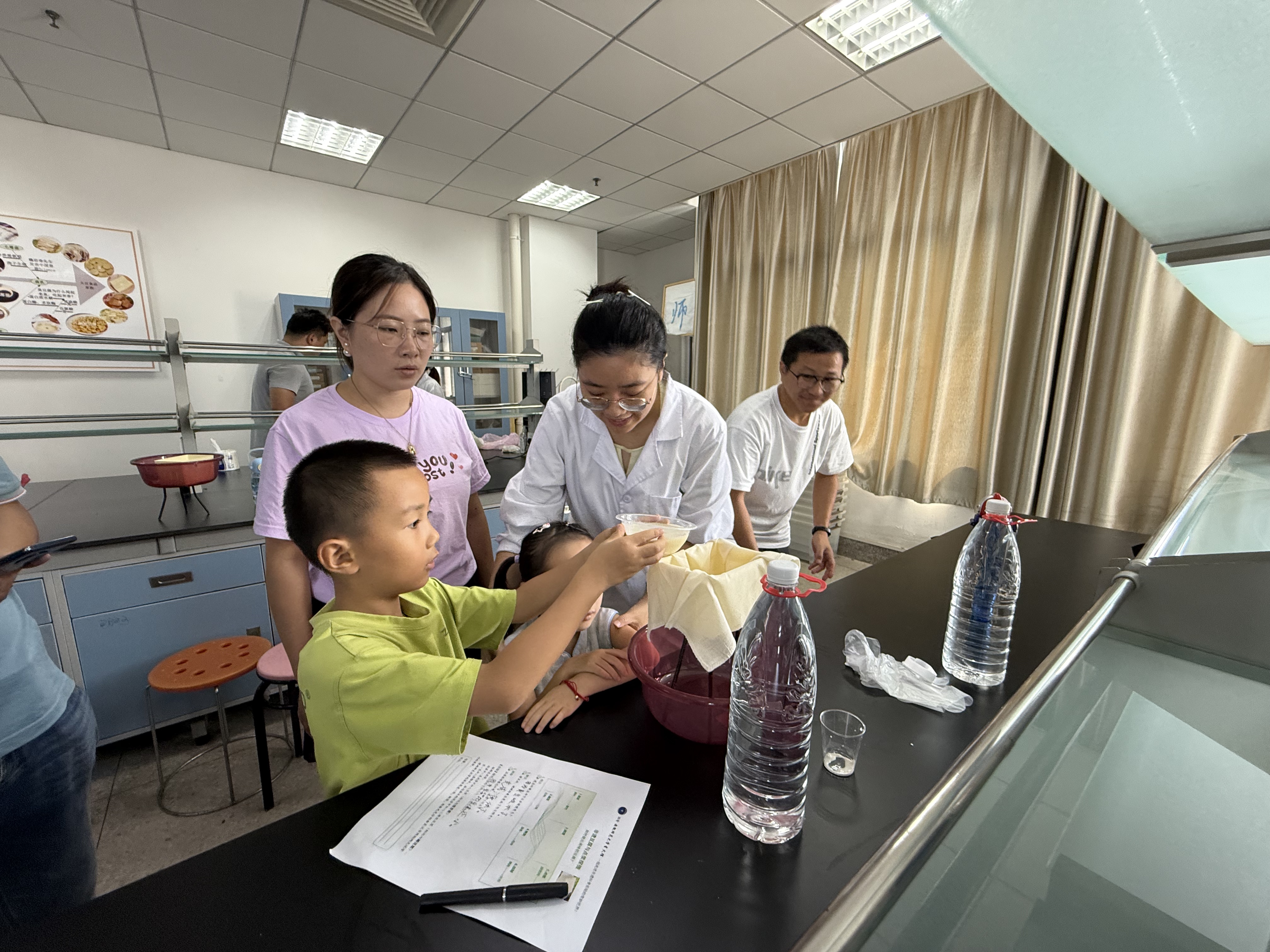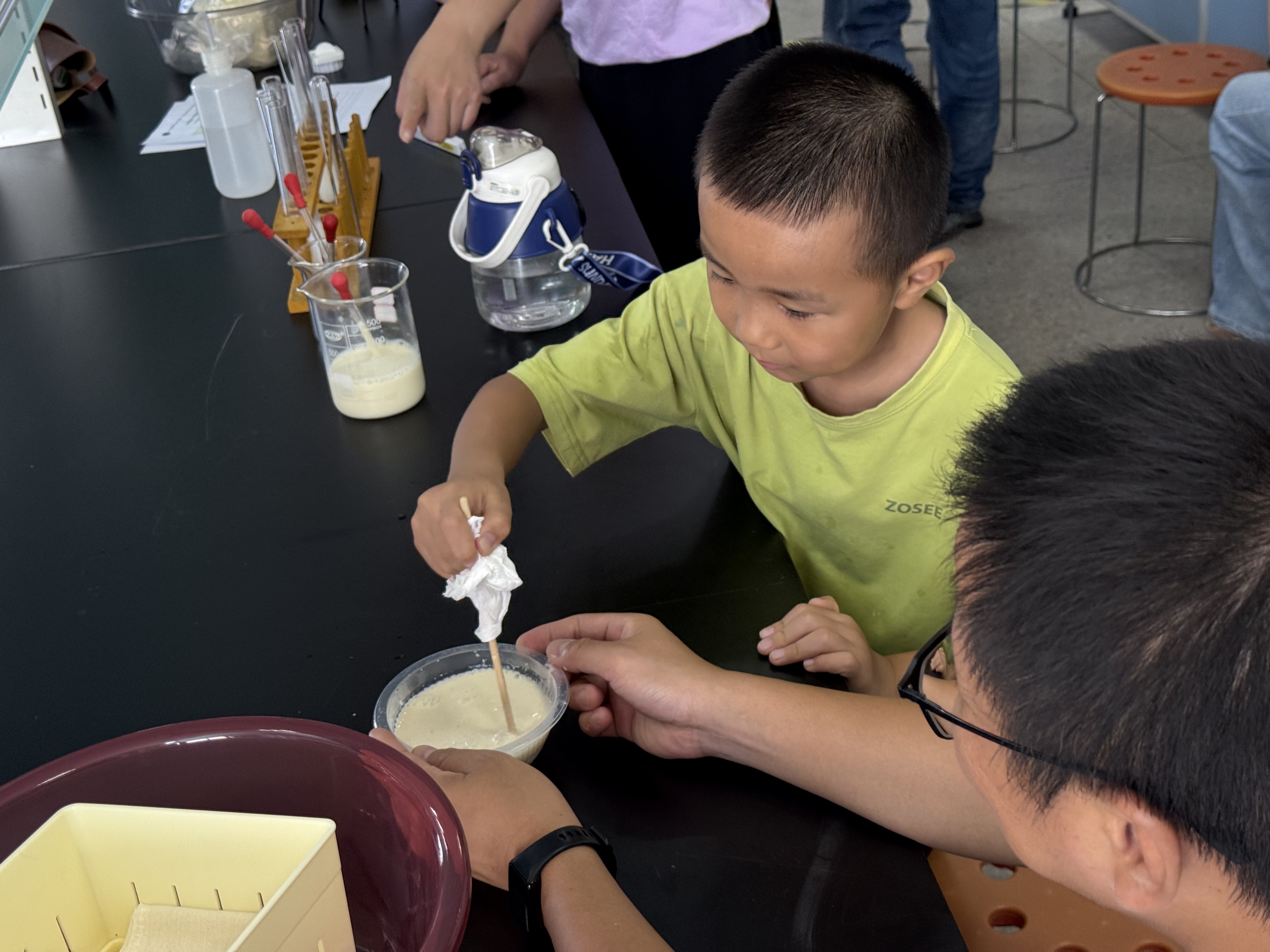 活动尾声的 “成果验收” 充满惊喜:一组员工用石膏或内酯成功制出豆腐,而另一组则因首次操作时豆浆温度不足而未能凝固,这场小插曲让孩子们笑着领悟 “做豆腐也需讲科学” 的道理。最后,孩子们填写学案,记录实践中的感悟,让科普认知更扎实。