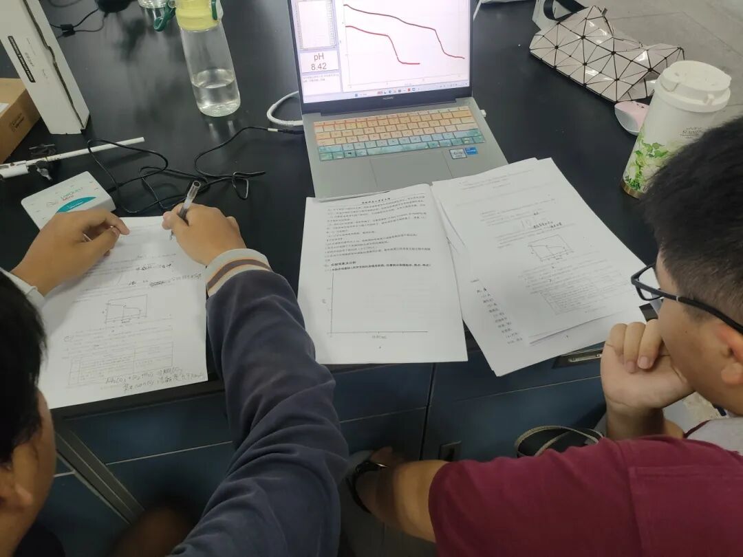 进入实验操作环节,师生们以 3人为一组展开探究,各组分工明确、配合默契:有的同学负责搭建实验装置,对照装置图固定滴数传感器位置、连接数据采集器与电脑,确认 pH 传感器玻璃泡完全浸没在溶液中;有的同学专注记录宏观现象,观察溶液颜色变化以及是否有气泡产生;还有同学负责实时追踪电脑屏幕上的曲线变化,在学案上标注曲线起点、拐点、终点。