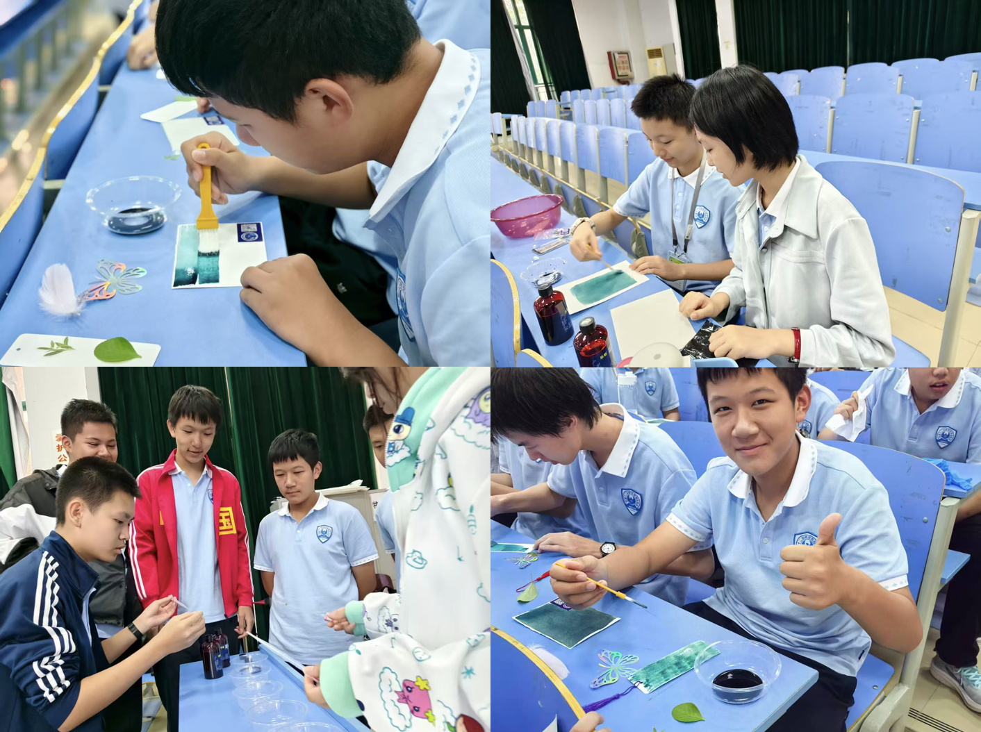 “蓝晒实验”小组则充满“艺术气息”。员工们先用滴管按1:1比例混合蓝晒液A和B,用尼龙刷均匀涂抹在专业纸上,待晾干后,放上蝴蝶、树叶、羽毛等自己喜欢的模板,用胶带固定好。活动结束后只需在阳光下晒制20分钟左右,揭下固定胶带,再放入水中漂洗,即可得到一件件“天然印染的艺术品”,在感受“光化学原理”的同时,也体验了“科技与艺术结合”的乐趣。