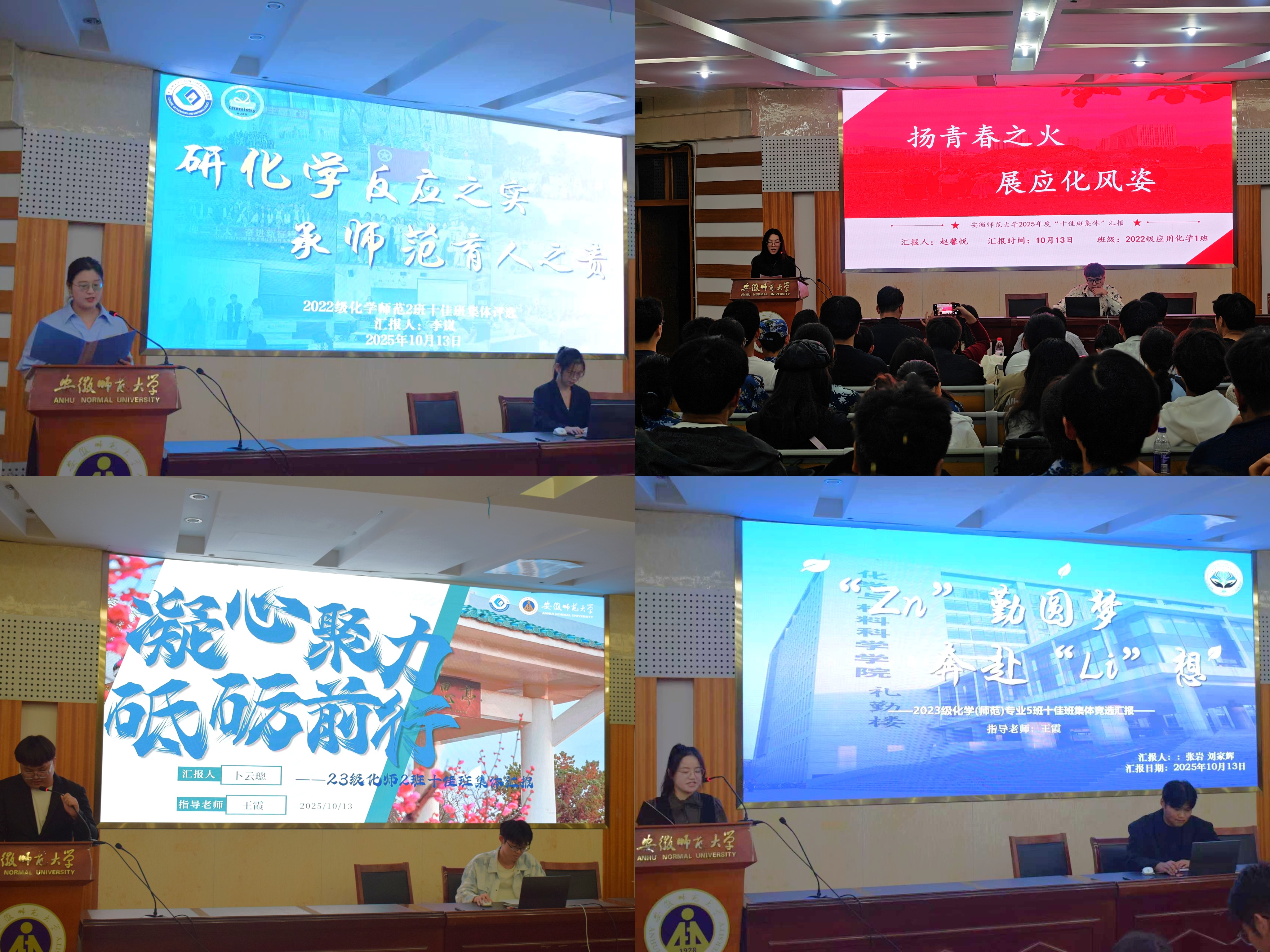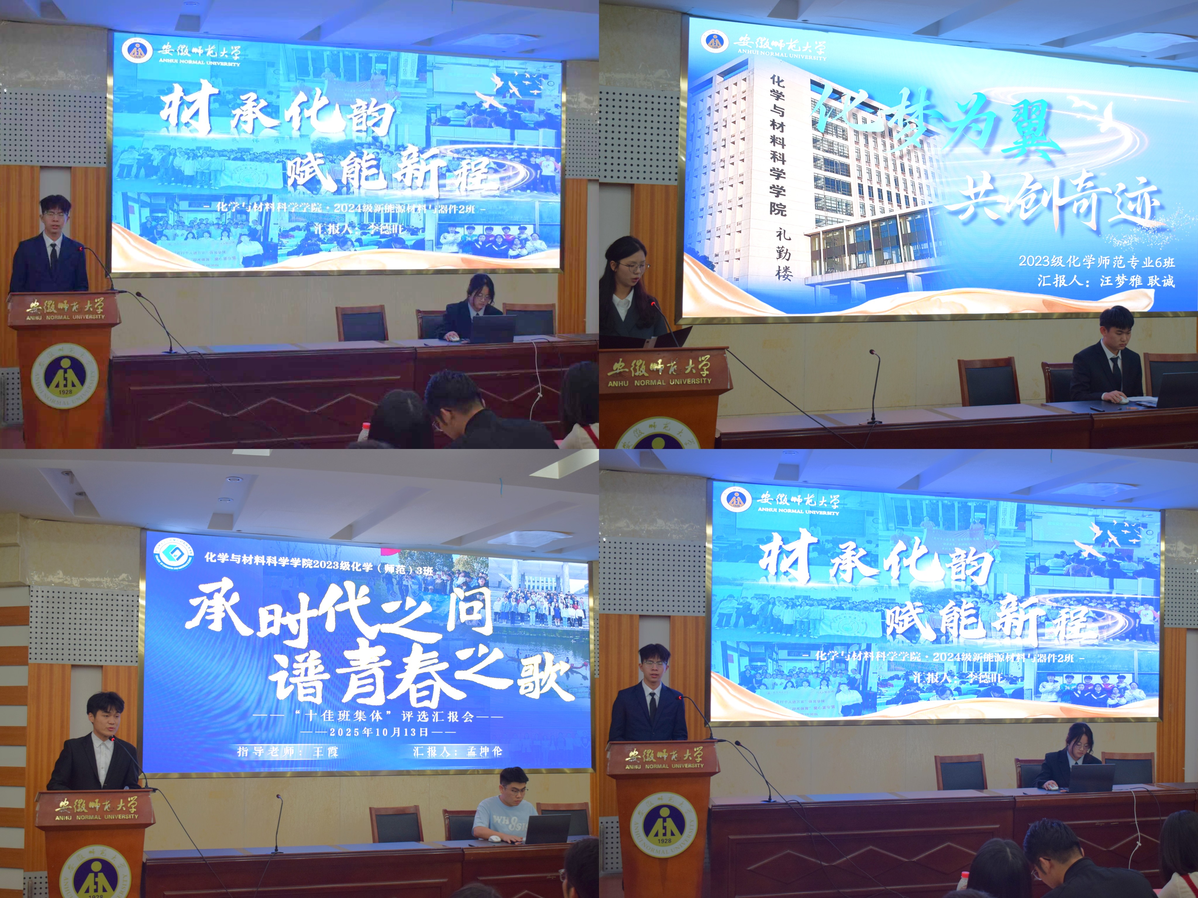 本次公司“十佳班集体”评选共有18个参评班级现场汇报。2024级化学(师范)5班、新能源材料与器件1班等,着重展示了他们从入学至今的快速融入与成长,通过一系列破冰活动、学习小组和主题团日,迅速凝聚起强大的班级向心力。2023级新能源材料与器件2班、应用化学2班的同学们分享了在实验室和项目竞赛中的探索与收获,体现了化材学子扎实的学术功底与创新意识。2022级化学(师范)2班、化学工程与工艺2班等班级,则系统梳理了过往三年的积累,并对未来的升学就业规划进行了展望,为学弟学妹们提供了宝贵的经验。各班级的演讲十分精彩,每一段文字、每一张图片,体现化材学子对于良好班风建设追求。