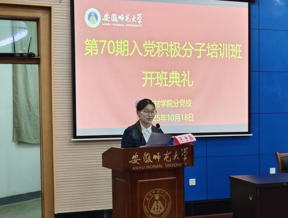 开班仪式在庄严的国歌声中拉开帷幕。梁成宣读了培训班班委任命及班级管理制度。2023级应用化学专业茅宇鑫同学作为学员代表发言。她表示,作为新时代青年,应充分认识到参加入党积极分子培训的重要意义,要以此次培训为新起点,坚定理想信念,牢记党的初心与使命,孜孜不倦的学习党的思想,对标党的行动指南,约束自身行为,让青春在党旗的照耀下绽放光芒。